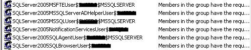 Well, I had the pleasure to install a SQL 2005 active/passive cluster recently and thought I’d share a little bit on the concept of Domain Groups for Clustered Services. When SQL 2005 is installed on a non-clustered server, it creates 6 local groups, adds the specified SQL Service accounts, and grants the necessary permissions for files and folders to these local groups. The groups created are shown below: