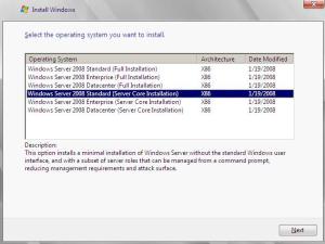 The installation of Server Core is pretty straightforward and can be completed in roughly 8 steps. I’ll assume most of you know how to install Windows so I’ll skip that part of it. Suffice to say, when you are prompted to select the operating system to install, choose the appropriate version of Server Core: