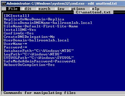 To install AD using the text file, enter the command: dcpromo /answer:c:\unattend.txt