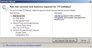 The TS Gateway role requires several additional Windows services such as IIS and the RPC over HTTP Proxy. If these services are not installed before installing the TS Gateway, you will be prompted to do so as shown below. Click Add Required Role Services.