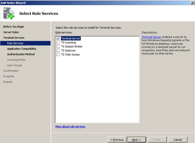As with all previous versions of terminal services, it is recommended that applications be installed after the Terminal Server role is enabled, thus ensuring applications are configured to run properly in a multi-user environment.