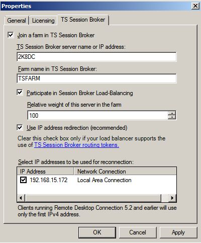 Once the computer objects are added to the Session Directory Computers group, you then tell the Terminal Servers to join the Session Broker Farm and participate in Session Broker Load Balancing. As stated before, this can be done manually (shown below) or through Group Policy.