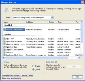 2. On the Manage Add-ons window, the Terminal Services ActiveX Control is likely disabled. With the Microsoft Terminal Services ActiveX Control highlighted, under the Settings heading, click Enable and OK.