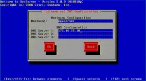 10. Next, the Hostname and DNS Configurationscreen appears. Specify the hostname and DNS servers to use and choose Ok.