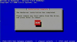 14. A progress bar displays as installation commences. A completion message displays when installation finishes. Choose Ok when the Installation Complete screen appears to reboot the system and finalize the installation.