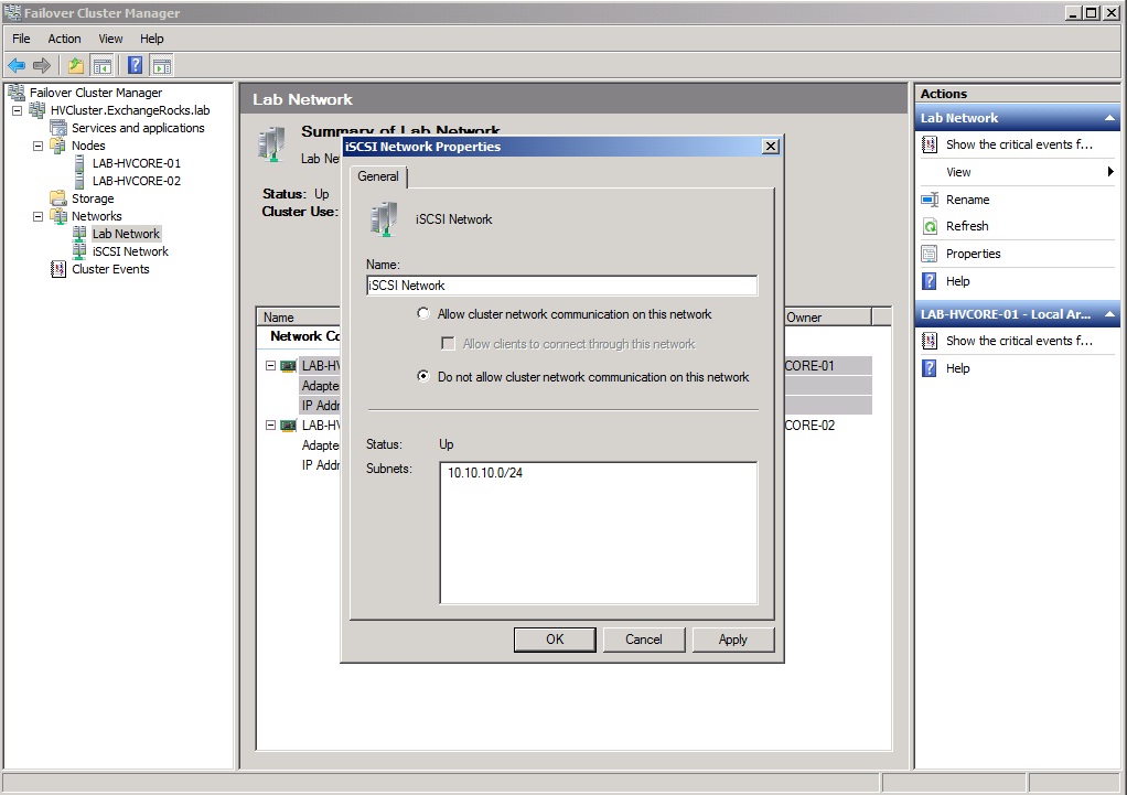 8. Within Failover Cluster Manager, rename the Networks to more descriptive names. On the properties on the iSCSI Network, select Do not allow cluster network communication on this network.