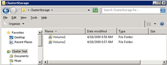 CSV volumes are stored as directories and subdirectories beneath the ClusterStorage root folder, which typically exists on the root of C: to provide a consistent file namespace to all Hyper-V cluster nodes. This ensures any VMs stored on a CSV have the same name and path from any cluster node. In this example, the CSV volumes (Volume1 and Volume2) are stored in the ClusterStorage folder on the root of C:, thus, the fully qualified path to each of the CSV volumes will be: