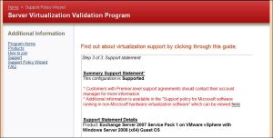 Use the Support Policy Wizard at web site below to determine if your particular virtualization platform will support a chosen Microsoft application. In this quick example, we’ll determine if Windows 2008 x64 running Exchange 2007 SP1 is supported on vSphere.