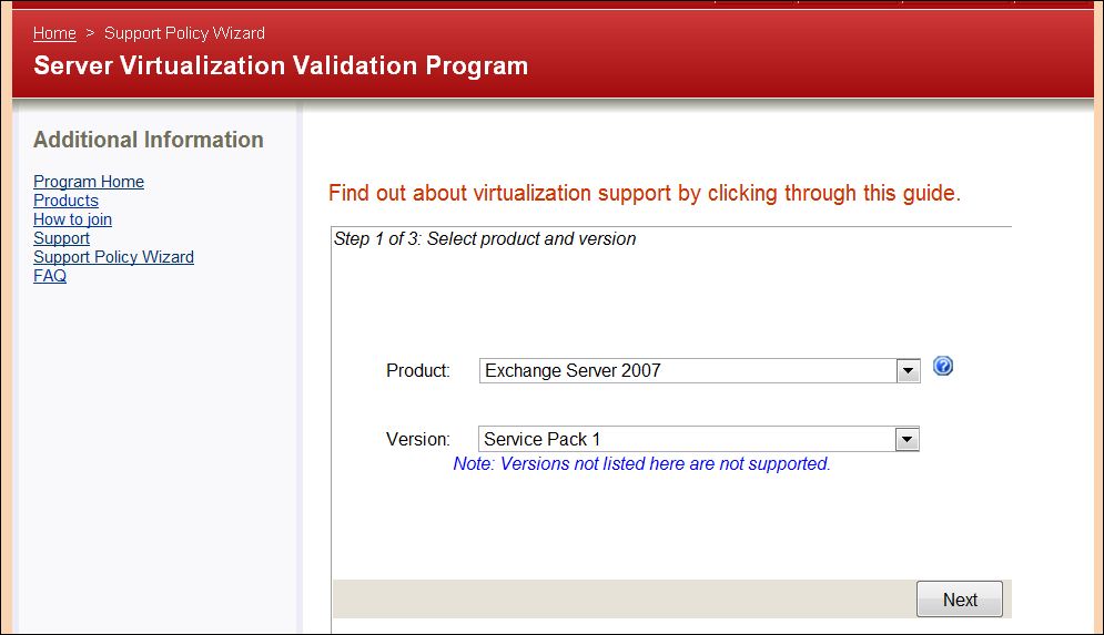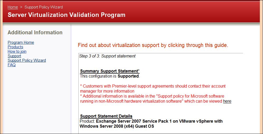 Use the Support Policy Wizard at web site below to determine if your particular virtualization platform will support a chosen Microsoft application. In this quick example, we’ll determine if Windows 2008 x64 running Exchange 2007 SP1 is supported on vSphere.