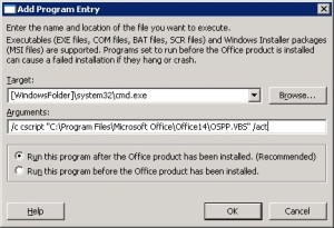 Depending on how the options are setup in the MSP, you can make the install completely hidden, or somewhat interactive. At least initially, I like to see that it’s working so I had it pop-up the Choose the installation you want and the Complete your office experience dialogs boxes come up. It removed Office 2003 as expected and asked me to reboot to complete the install. Once back up, Office 2010 was there, Outlook opened to my mailbox, and I did not see the Office 2010 introductory pop-ups, however, it did prompt me to activate office. I didn’t want that to happen either and to get around that, I followed the instructions found here: