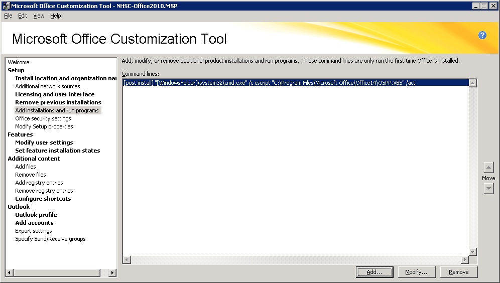 Anyway, to run setup with the new OST file manually, enter the command: setup.exe /adminfile \\server\share\FileName.msp. I copied my MSP to the Office 2010 root directory so all I had to do was enter setup.exe /adminfile Office2010.msp.