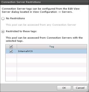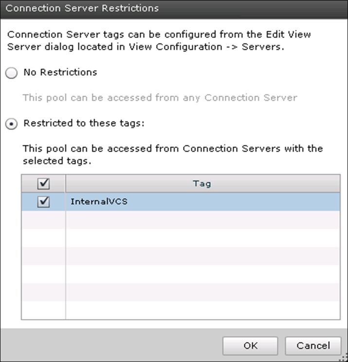 With restricted entitlements, you assign one or more tags to a View Connection Server instance. Then, when configuring a desktop pool, you select the tags of the View Connection Server instances that you want to be able to access the desktop pool.
