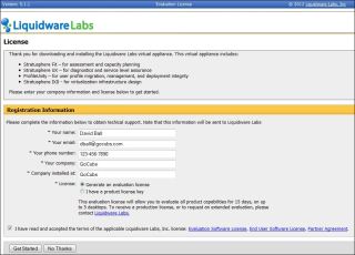 The first thing you will be prompted to do is accept the license agreement. Click I Agree to get to the License page. On the License page, enter your name and company information. If you have obtained your Stratusphere license from Liquidware Labs you can click I have a product license key and then import the license data from LL. Otherwise, select Generate an evaluation license which will give you 5 client licenses and allow for the continuation of the installation, but get in touch with LL as soon as possible. Check the box indicating you have read the license agreement and click Get Started.
