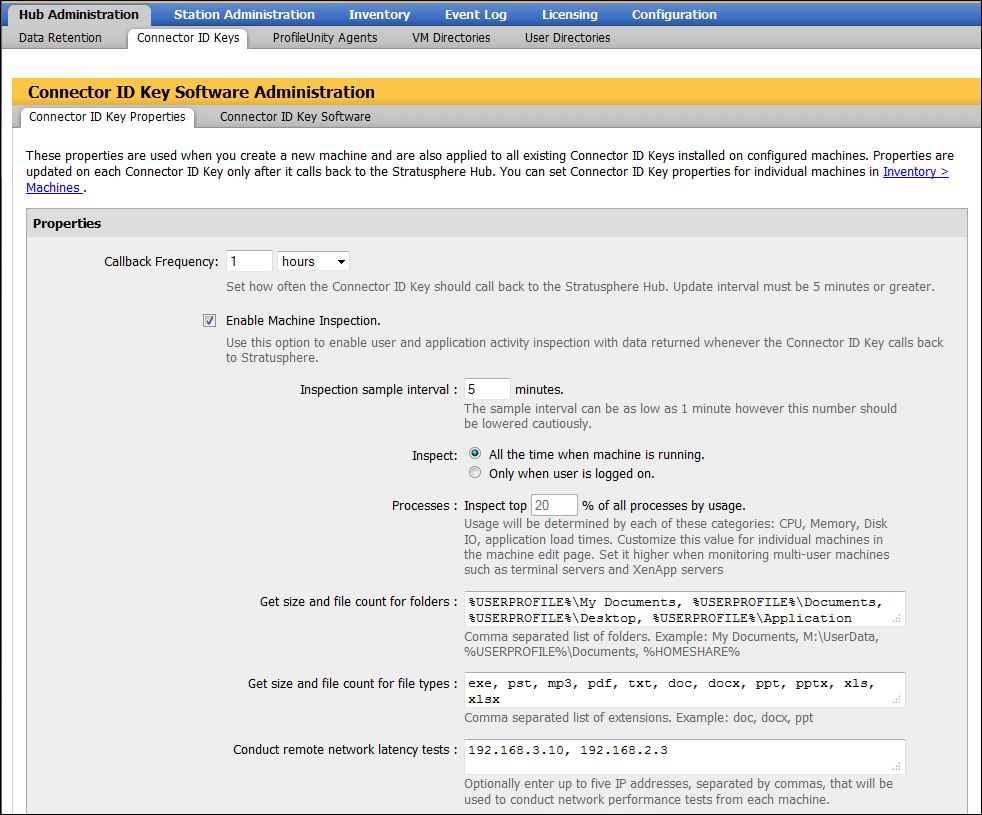 If the IP address was changed, you will be logged out and will need to log back in. Click Hub Administration | Connector ID Keys | Connector ID Key Properties. Here, you want to set the appropriate Callback Frequency and Inspection sample interval. The defaults are 1 hour and 5 minutes. Stratusphere FIT is not a real-time data collection tool in that the agents are not continuously and actively updating clients every second they’re running. The Callback Frequency setting controls how often the agent sends it performance data to the hub appliance, the inspection sample interval controls when data is pulled from inside the client.