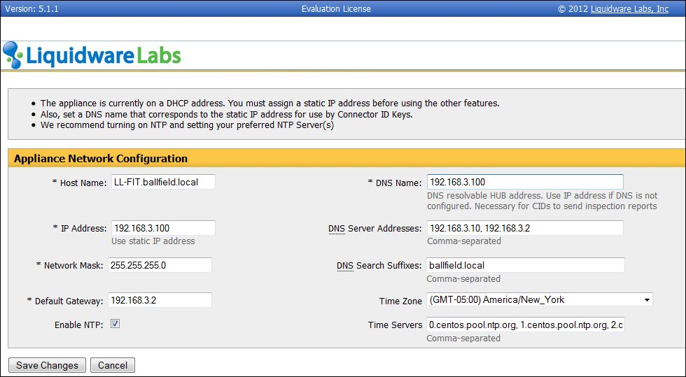 Next, the Appliance Network Configuration page is displayed. Here, you set the hostname, IP address, netmask, gateway, etc. of the hub appliance. It is highly recommended that you use a static IP address. If the address of the appliance changes, data collection will be impacted. We will look at configuring the agents later and you’ll see that though changing the IP address may not be catastrophic it is inconvenient and could result in a “hole” in our data collection. I have had customers use DHCP, but once the appliance has its address, a DHCP reservation is added using the MAC address of the hub appliance VM. Perhaps the most important setting is the DNS Name. In this case, I used the IP address of my appliance. If this value is setup incorrectly, data collection will not work. If a hostname is added within DNS Name, you must make sure that FQDN is resolvable by adding a host (A) record to your DNS lookup zones. When the appropriate settings have been entered, click Save Changes.