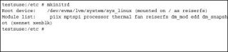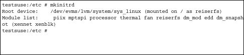 This creates a new initrd file with the correct settings for the boot device. The changes do not take effect until the server is restarted. Do not restart at this time.