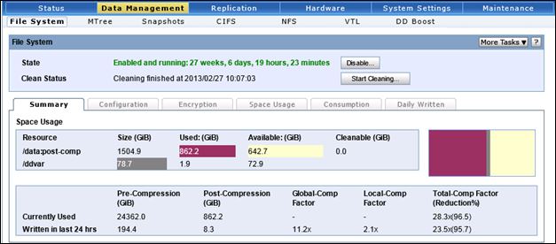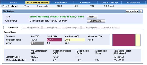 5. Finally, I wanted to “clean” the space on the DataDomain manually as opposed to waiting for it to automatically do so on its schedule. I logged into the DD and on the Data Management | File System page, clicked Start Cleaning. In this case, after deleting my older save sets, I had 400GB of space I could recover.