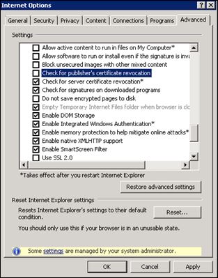 This may be yet another entry that benefits me the most, but I feel like I’ve spent weeks waiting for Citrix Studio to open, seems like it takes entirely too long. After doing some searching, I found this post and the workaround helped tremendously, basically disabling the Check for publisher’s certificate revocation within Internet Explorer’s Advanced settings tab as shown below: