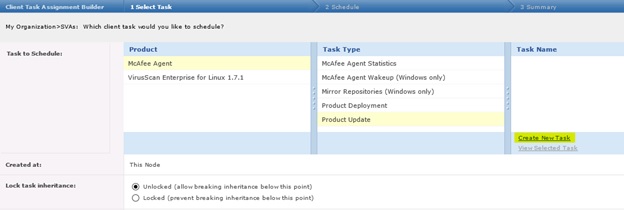 3. On the Client Task Assignment screen, select McAfee Agent | Product Update | Create New Task