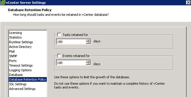 In order to limit the growth of a vCenter Server database, you can use the database retention policy settings to discard unneeded data regarding tasks and events after a specified period of time. This is important to understand because one of two outcomes can occur pretty easily over time….each causing major problems at the most inconvenient of times: