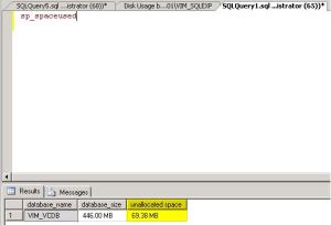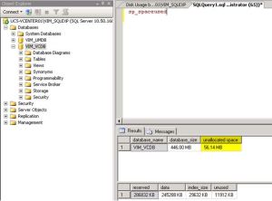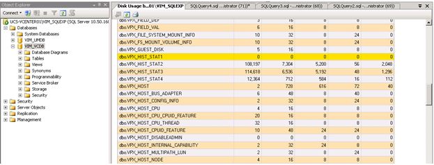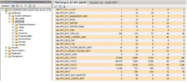 Though the most likely cause for database growth will be the dbo.VPX_EVENT, dbo.VPX_EVENT_ARG, and dbo.VPX_HIST_STATx tables, you can see the sizes of specific tables within the database by looking at the Disk Usage by Table SQL Report as shown below: