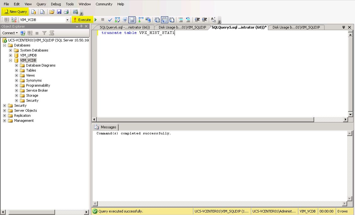 As you can see, on my vCenter server, the dbo.VPX_HIST_STATx tables are consuming the bulk of the space. There are (4) tables which represent daily, weekly, monthly, and yearly statistics. To remove all of the data contained within the dbo.VPX_HIST_STAT1 table, execute the following Query using SQL Management Studio: