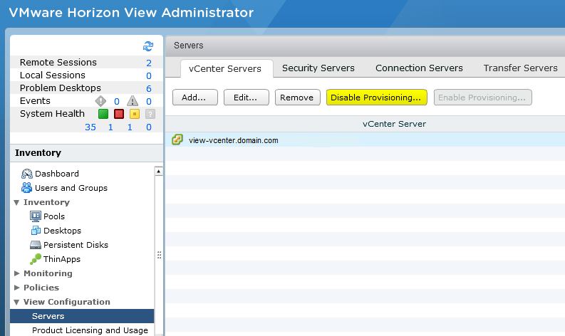 2. Open View Administrator, expand View Configuration and select Servers. On the vCenter Servers tab, click Disable Provisioning.